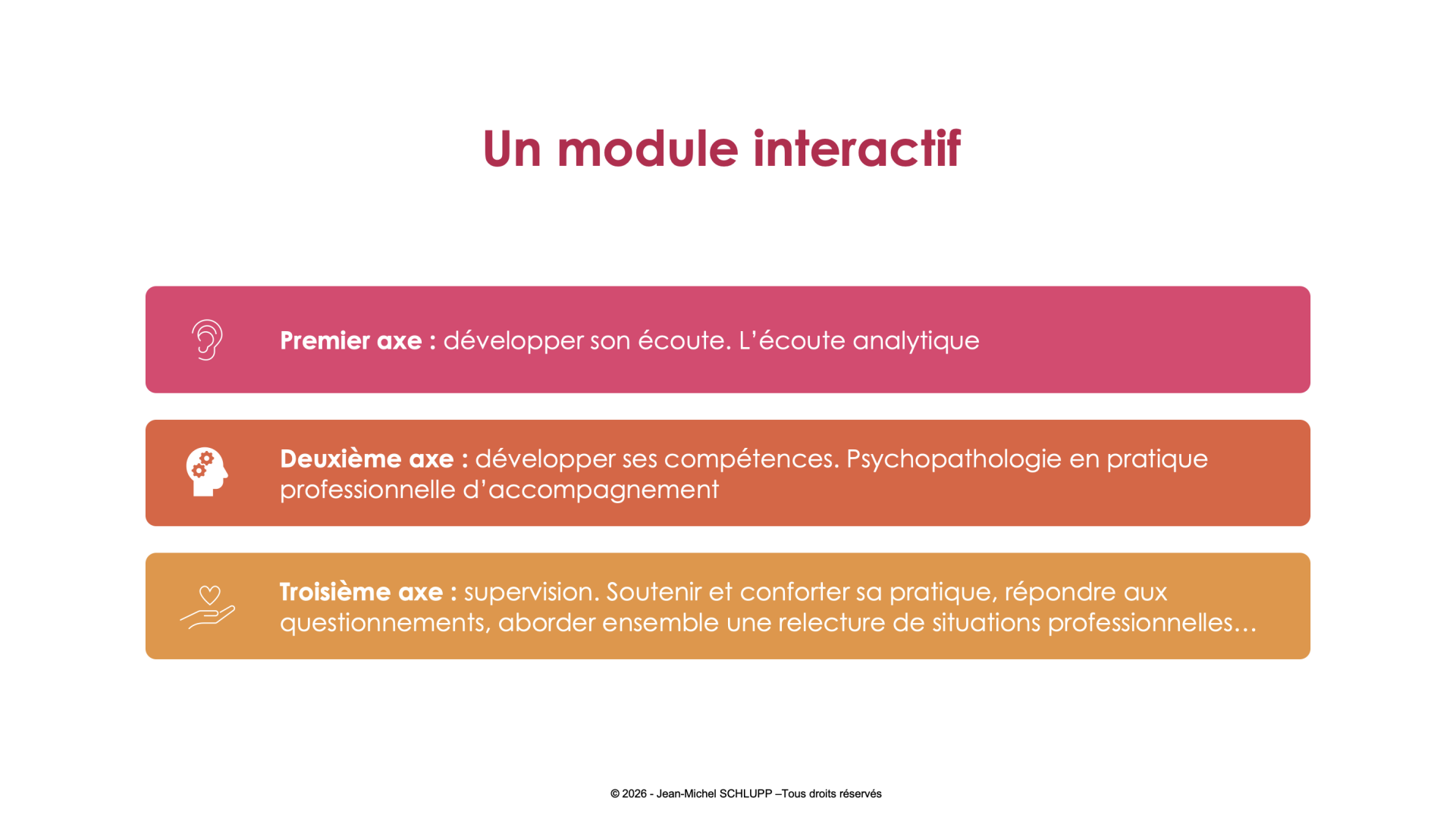 Ainsi, ce module unique et interactif : « Psychopathologie, Écoute Analytique et Supervision », est articulé autour de trois piliers interdépendants :